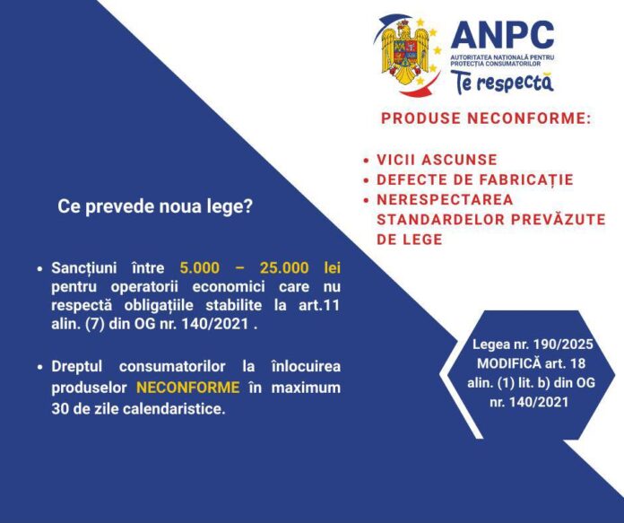 Potrivit ANPC, neconformitatea poate rezulta din defecte ascunse, probleme de fabricație sau neîndeplinirea standardelor legale. În comunicatul emis luni, autoritatea a subliniat importanța unei interpretări corecte a termenilor folosiți pentru evaluarea practicilor comerciale conform Legii nr. 190/2025.