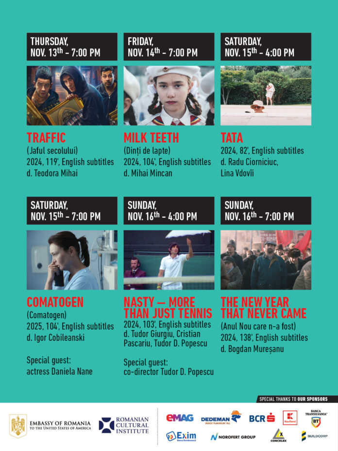 Pe parcursul evenimentului vor fi proiectate şi filme precum „Dinţi de lapte”, „Tata”, „Comatogen”, „Nasty” şi „Anul Nou care n-a fost”. Publicul american va putea întâlni actriţa Daniela Nane, precum şi pe Tudor D. Popescu, iar regizoarea Teodora Ana Mihai se va conecta online. Cristian Mungiu va transmite un mesaj înregistrat.